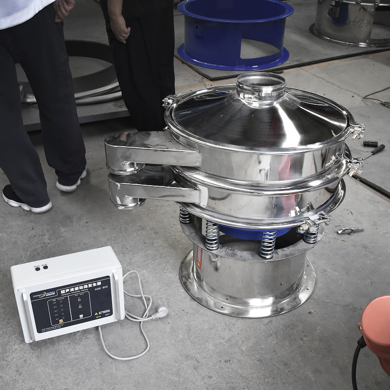 モーターは偏心ブロックを使用して、ふるい本体に多次元複合振動を与え、材料をふるい面に移動させます。小さな粒子は選別および分類できます。一方、超音波発生器は、トランスデューサーを介して電気エネルギーを高周波機械振動に変換し、ふるいメッシュに作用させます。2つの振動が連携して機能します。前者は選別力を提供し、後者は付着した粒子を除去し、スクリーンの目詰まりを防ぎ、効率的かつ正確なスクリーニングを実現します。